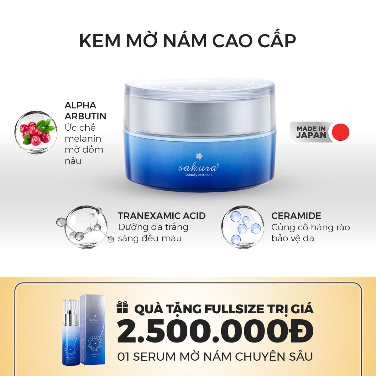 Kem giảm nám toàn diện Sakura Transforming Cream với công thức 3 tác động giúp giảm nám lên đến đến 70% sau 3 tháng sử dụng. Với cách sử dụng đơn giản và mang lại hiệu quả cao, Sakura làm hài lòng tuyệt đối hầu hết chị em người dùng. Đặc biệt sản phẩm siêu an toàn và lành tính phù hợp với bất cứ loại da nào.