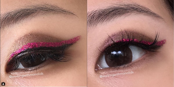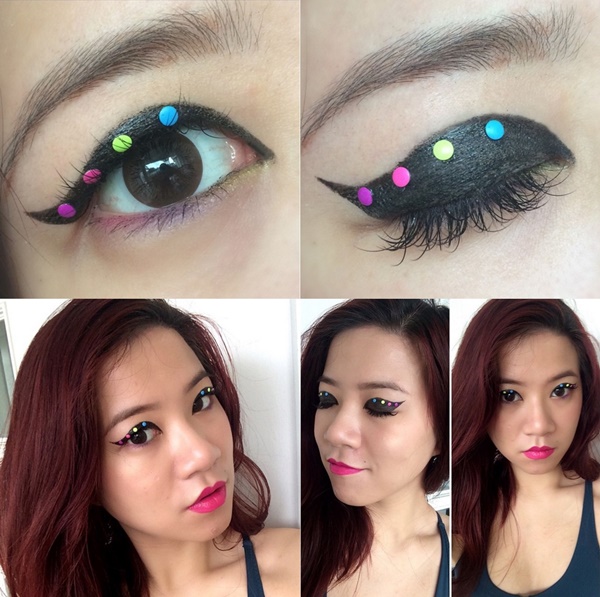 Cách trang điểm này khá đơn giản, nhưng lại vô cùng bắt mắt, cho bạn diện mạo nổi bật giống như các blogger sành điệu. Về kỹ thuật cơ bản, bạn chỉ cần dùng bút kẻ mắt tô kín 1/2 bầu mắt với phần đuôi hất lên kiểu mắt mèo. Sau đó, dùng các hạt đính màu neon để dán lên mí mắt bằng keo dán mí. Cách này phù hợp với những cô nàng không thích dùng phấn mắt mà vẫn tạo được nhiều sắc màu cho đôi mắt. Bạn nên kết hợp kiểu trang điểm này với son môi màu hồng neon cho hợp tông nhé.