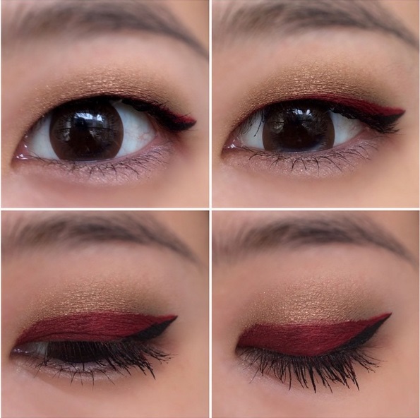 Trước hết bạn phải thoa phấn có nhũ màu sáng lên khắp bầu mắt, sau đó dùng phấn mắt màu rượu vang thoa kín hết 1/2 bầu mắt. Cuối cùng, chỉ cần dùng bút dạ kẻ mắt kẻ một đường hất lên từ đuôi mắt, như vậy là khi mở mắt ra, bạn đã có kiểu mắt mèo màu rượu vang quyến rũ, rất hợp với màu mắt nâu đặc trưng của người châu Á.