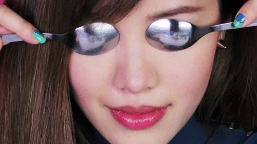 Để 2 chiếc thìa inox vào tủ lạnh qua đêm. Vào buổi sáng bạn có thể chườm lên bọng mắt như hình khoảng 2-3’.