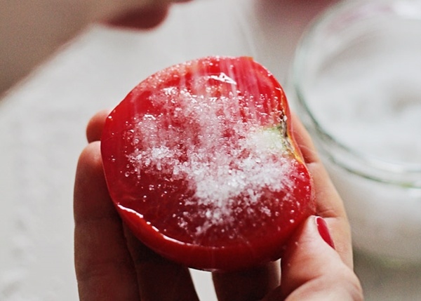 Cắt cà chua thành lát, đổ đường ra đĩa rồi cho các lát cà chua lên trên, sau đó chà đều lát cà chua lên mặt. Cách này sẽ giúp bạn loại bỏ các tế bào chết bám trên da, lấy lại làn da trắng mịn bên trong.