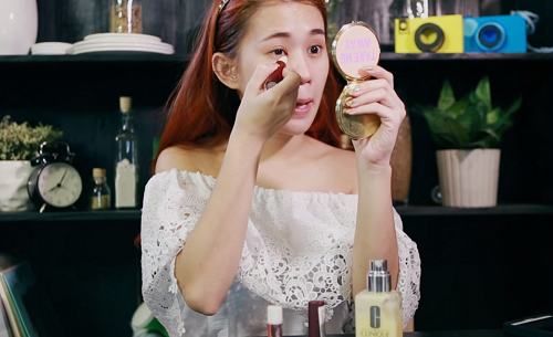 Đầu tiên, Ngọc Thảo dùng baby oil để tẩy trang, chú trọng phần mắt và môi. Đây là hai phần thường được trang điểm rất kỹ để tạo sự sắc nét cho gương mặt. Sau đó, rửa mặt sạch sẽ cho hết lớp dầu nhờn.