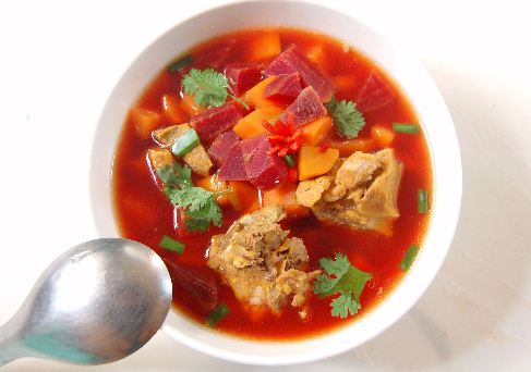 Món canh cực kỳ dễ làm với nguyên liệu đơn giản: khoai tây, cà rốt, su su, củ dền đỏ, nấm, xương heo hoặc sườn heo, hành lá, tiêu đen.