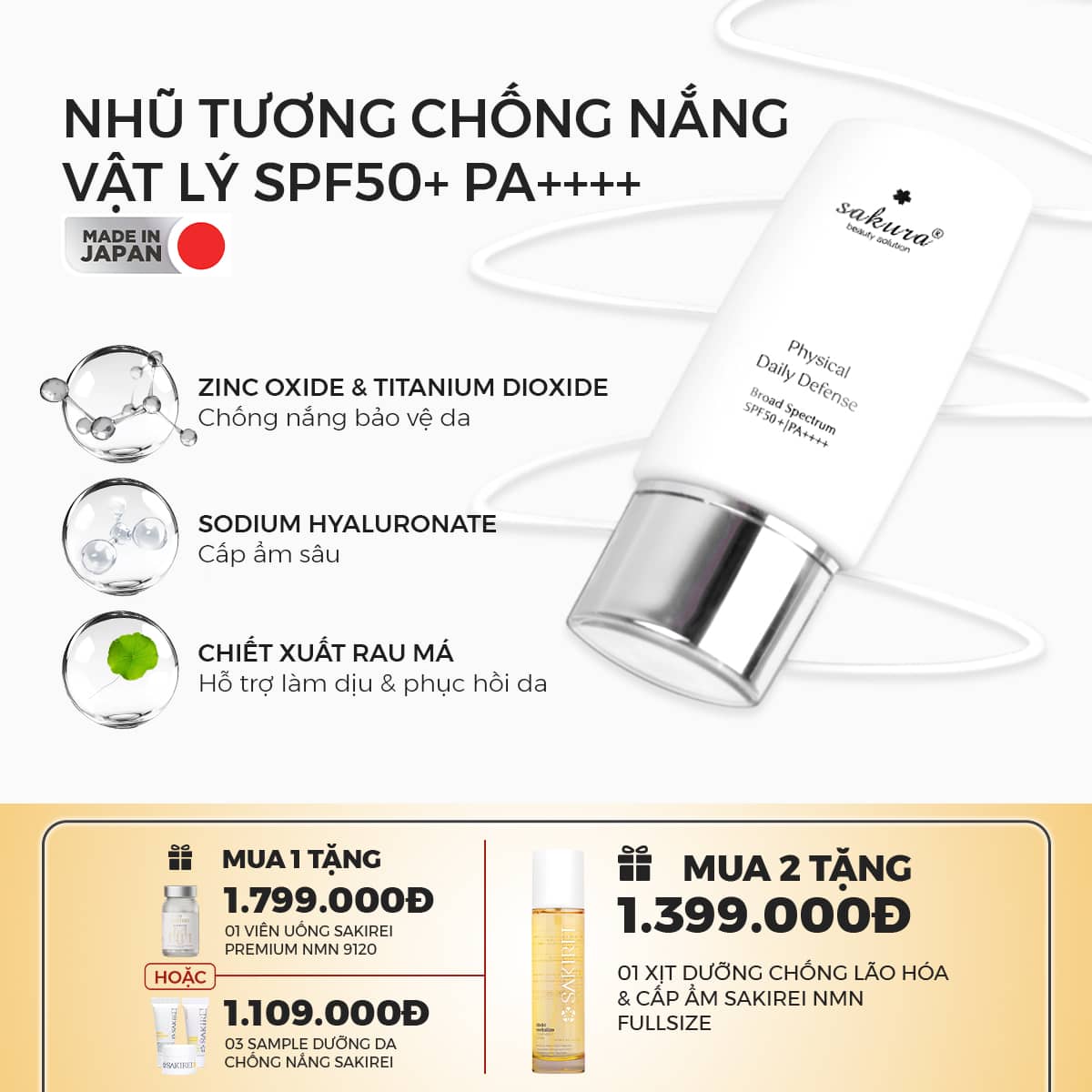 Nhũ tương chống nắng vật lý Sakura Physical Daily Defense SPF 50+ PA ++++ là Sản phẩm chống nắng vật lý với công thức dạng nhũ tương dịu nhẹ, hoàn toàn không chứa Silicon, dầu và cồn khoáng, Là giải pháp an toàn cho những ai muốn bảo vệ da khỏi ánh nắng mặt trời nhưng không muốn lưu lại lớp kem bao phủ dày và trắng bệt trên bề mặt da, điều này hoàn toàn khác biệt với các loại kem chống nắng và kem lót trang điểm khác.