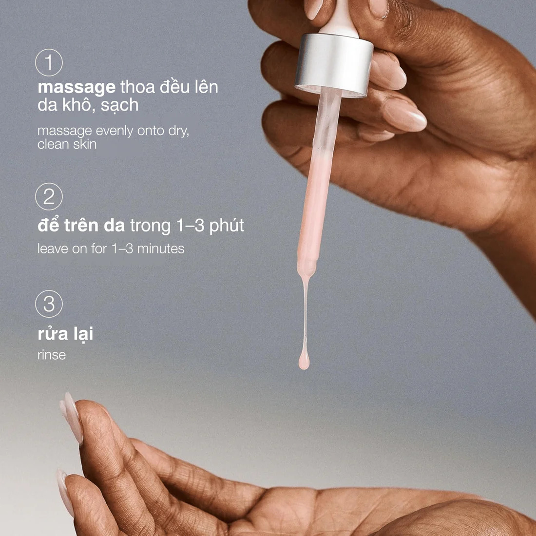 Bước 3: Chờ sản phẩm hoạt động trên da chỉ từ 1 - 3 phút. Bạn có thể sẽ cảm thấy châm chích nhẹ – đây là phản ứng hoàn toàn bình thường khi các acid đang phát huy tác dụng.