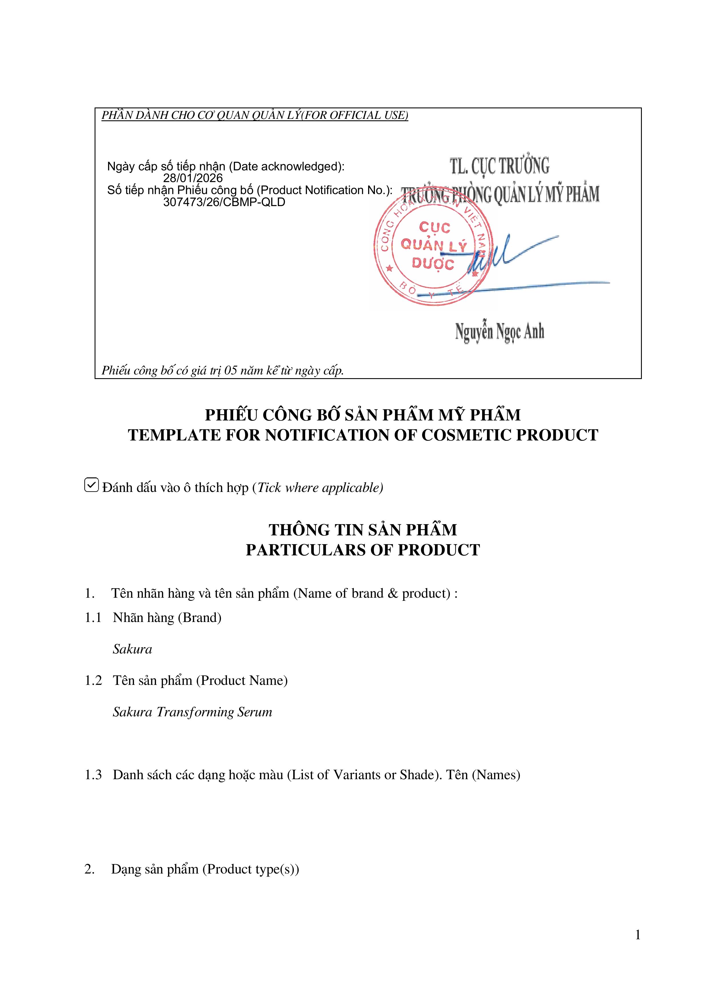 Serum giảm nám toàn diện Sakura Transforming Serum là serum làm mờ vết nám mới nhất đến từ thương hiệu Dược mỹ phẩm cao cấp Sakura Beauty Vietnam. Đây là sản phẩm duy nhất hiện nay được kết hợp tối ưu từ các thành phần Tranexamic Acid và Alpha Arbutin - 2 hoạt chất vàng tuy đắt đỏ nhưng cũng là hiệu quả nhất trong việc sử dụng nám da.